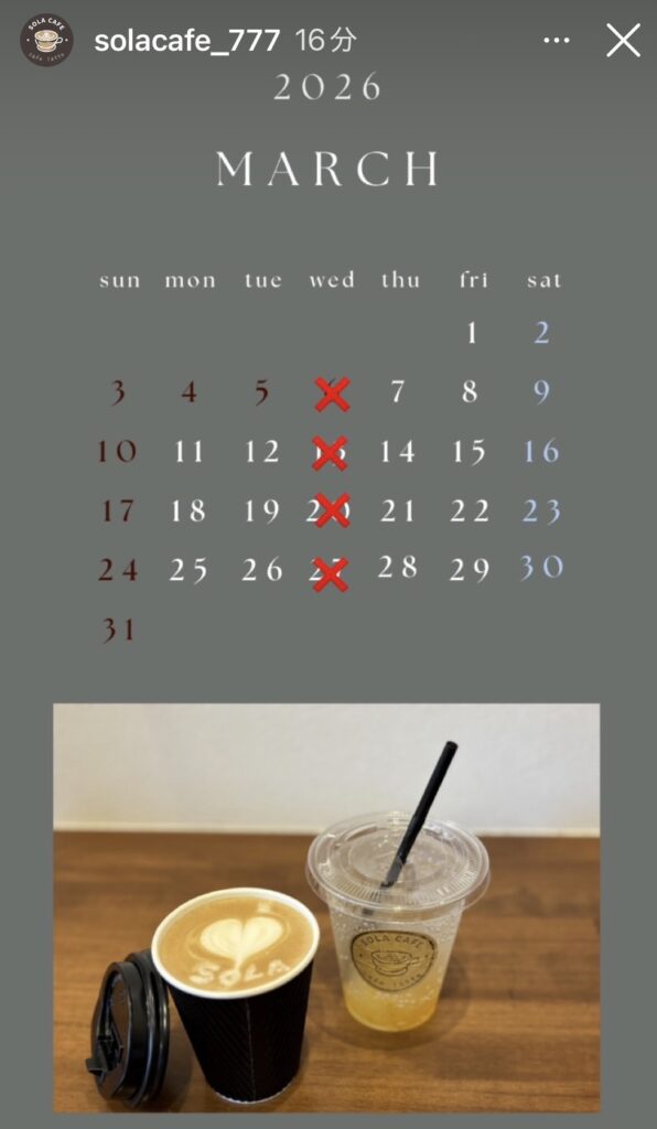 2026年5月 定休日のお知らせ 2026 4/30 定休日 2026年4月30日 いつもSOLA CAFEにご来店いただきありがとうございます。2026年5月の定休日をお知らせします。5月は毎週水曜日がお休みです。今月もたくさんのお客様のご来店心よりお待ちしております。 NEWS TOPに戻る 定休日 よかったらシェアしてね! URLをコピーする URLをコピーしました! URLをコピーしました!